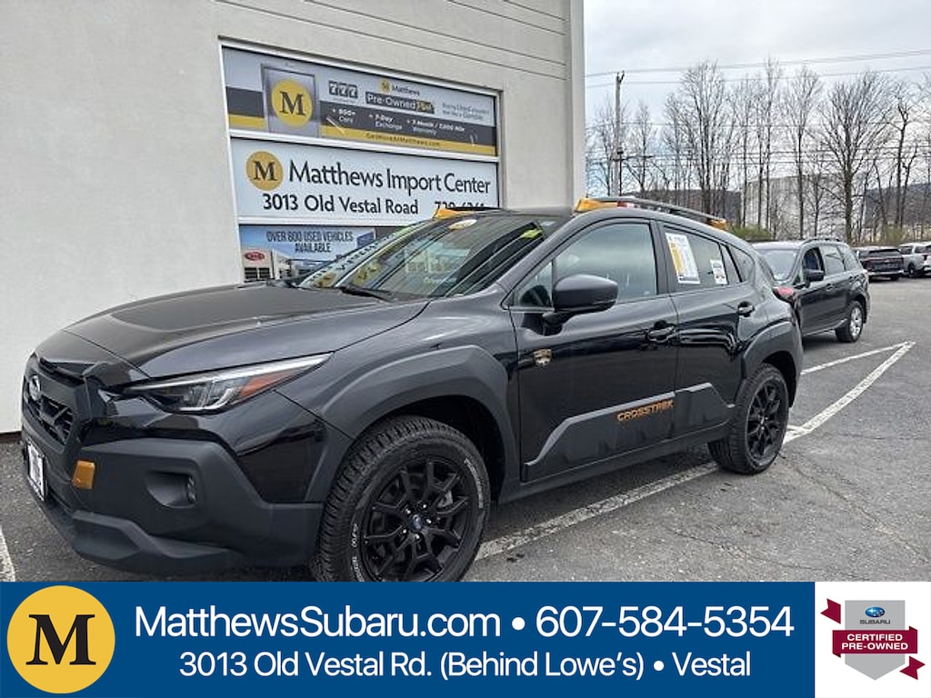 Matthews Import Center promises each customer a thorough and confident 120-point inspection on our used inventory guaranteeing a relaxing and peace-of-mind experience. We are located behind Lowes in Vestal NY. Or call us at (607) 729 - 6261Matthews Import Center3013 Old Vestal RoadVestal NY 13850. Certified. Crystal Black Silica 2025 Subaru Wilderness Crosstrek AWD Lineartronic CVT 2.5L 4-Cylinder DOHC 16VOdometer is 3565 miles below market average! 25/29 City/Highway MPGSubaru Certified Pre-Owned Details: * Transferable Warranty * Warranty Deductible: $0 * Roadside Assistance * 152 Point Inspection * SiriusXM 3-Month trial subscription $500 Owner Loyalty coupon & 1 year trial subscription to STARLINK * Powertrain Limited Warranty: 84 Month/100000 Mile (whichever comes first) from original in-service date * Vehicle History