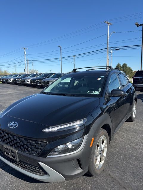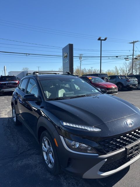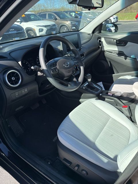 Abyss Black Pearl 2023 Hyundai Kona SEL AWD CVT 2.0L I4 DOHC Dual CVVT 17" x 7.0J Alloy Wheels, 4-Wheel Disc Brakes, 5.715 Axle Ratio, 6 Speakers, ABS brakes, Air Conditioning, Alloy wheels, AM/FM radio: SiriusXM, Apple CarPlay & Android Auto, Brake assist, Bumpers: body-color, Cargo Net, Cargo Tray, Carpeted Floor Mats, Cloth Seat Trim, Delay-off headlights, Driver door bin, Driver vanity mirror, Dual front impact airbags, Dual front side impact airbags, Electronic Stability Control, Emergency communication system: Blue Link Connected Car Service (3-year complimentary subscription), Exterior Parking Camera Rear, Four wheel independent suspension, Front anti-roll bar, Front Bucket Seats, Front Center Armrest, Front reading lights, Fully automatic headlights, Heated door mirrors, Illuminated entry, Low tire pressure warning, Occupant sensing airbag, Option Group 01, Outside temperature display, Overhead airbag, Overhead console, Panic alarm, Passenger door bin, Passenger vanity mirror, Power door mirrors, Power driver seat, Power steering, Power windows, Radio: AM/FM/HD/SiriusXM Audio System, Rear anti-roll bar, Rear seat center armrest, Rear window defroster, Rear window wiper, Remote keyless entry, Roof Rack Cross Rails (DISC), Security system, Speed control, Speed-sensing steering, Split folding rear seat, Spoiler, Steering wheel mounted audio controls, Tachometer, Telescoping steering wheel, Tilt steering wheel, Traction control, Trip computer, Turn signal indicator mirrors, Variably intermittent wipers.
