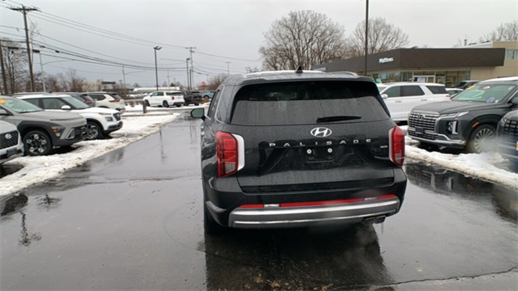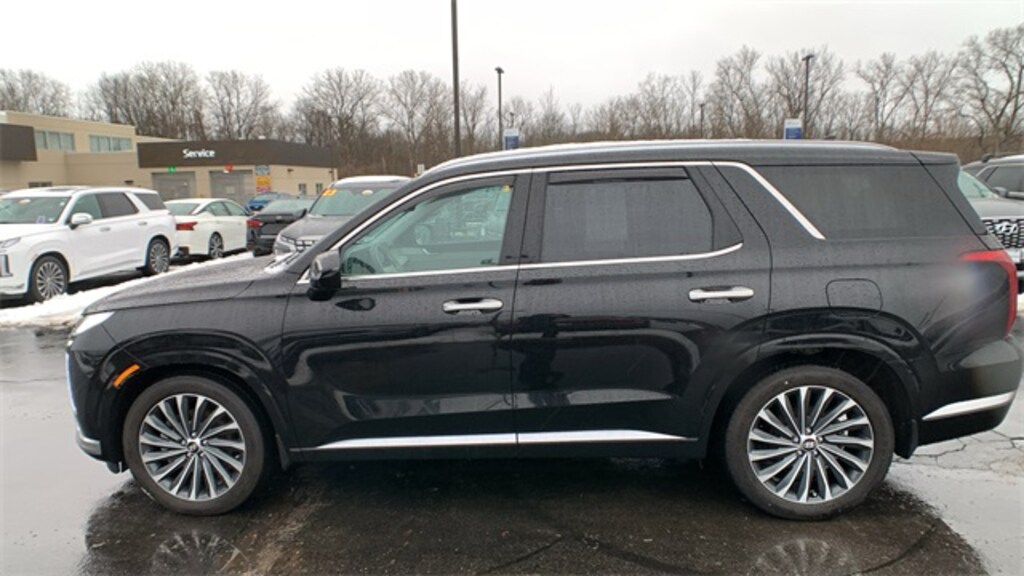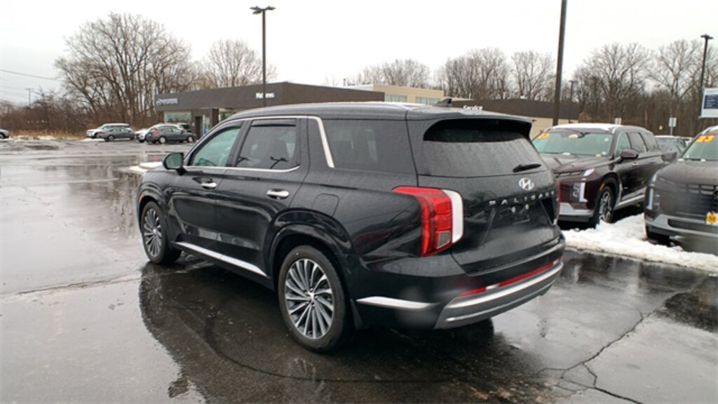Abyss Black Pearl 2023 Hyundai Palisade Calligraphy AWD 8-Speed Automatic with SHIFTRONIC V6 12 Speakers, 3.648 Axle Ratio, 3rd row seats: split-bench, 4-Wheel Disc Brakes, ABS brakes, Air Conditioning, Alloy wheels, AM/FM radio: SiriusXM, Apple CarPlay & Android Auto, Auto High-beam Headlights, Auto-dimming door mirrors, Auto-dimming Rear-View mirror, Auto-leveling suspension, Automatic temperature control, Brake assist, Bumpers: body-color, Cargo Net, Cargo Tray, Carpeted Floor Mats, Compass, Delay-off headlights, Driver door bin, Driver vanity mirror, Dual front impact airbags, Dual front side impact airbags, Electronic Stability Control, Emergency communication system: Blue Link Connected Car Service (3-year complimentary subscription), Exterior Parking Camera Rear, Four wheel independent suspension, Front anti-roll bar, Front Bucket Seats, Front Center Armrest, Front dual zone A/C, Front reading lights, Fully automatic headlights, Garage door transmitter: HomeLink, harman/kardon® Speakers, Heads-Up Display, Heated & Ventilated Front Bucket Seats, Heated door mirrors, Heated front seats, Heated rear seats, Heated steering wheel, Illuminated entry, Knee airbag, Low tire pressure warning, Memory seat, Navigation System, Occupant sensing airbag, Option Group 01, Outside temperature display, Overhead airbag, Overhead console, Panic alarm, Passenger door bin, Passenger vanity mirror, Power door mirrors, Power driver seat, Power Liftgate, Power moonroof, Power passenger seat, Power steering, Power windows, Premium Nappa Leather Seat Trim, Radio data system, Radio: AM/FM/MP3 Premium Audio System, Rain sensing wipers, Rear air conditioning, Rear anti-roll bar, Rear audio controls, Rear reading lights, Rear side impact airbag, Rear window defroster, Rear window wiper, Reclining 3rd row seat, Remote keyless entry, Security system, Speed control, Speed-sensing steering, Splash Trim, Split folding rear seat, Spoiler, Steering wheel mounted audio controls, Tachometer, Telescoping steering wheel, Tilt steering wheel, Traction control, Trip computer, Turn signal indicator mirrors, Variably intermittent wipers, Ventilated front seats, Ventilated rear seats, Wheel Locks, Wheels: 20" x 7.5J Calligraphy Exclusive Alloy.