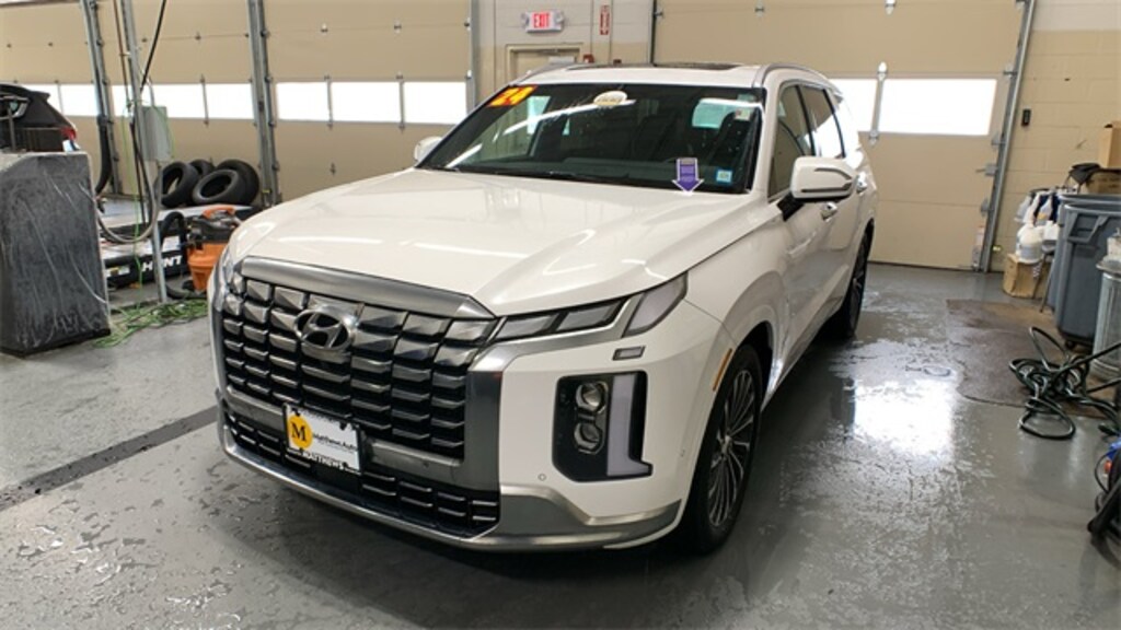 Hyper White 2024 Hyundai Palisade Calligraphy AWD 8-Speed Automatic with SHIFTRONIC V6 12 Speakers, 3.648 Axle Ratio, 3rd row seats: split-bench, 4-Wheel Disc Brakes, ABS brakes, Air Conditioning, Alloy wheels, AM/FM radio: SiriusXM, Apple CarPlay & Android Auto, Auto High-beam Headlights, Auto-dimming door mirrors, Auto-dimming Rear-View mirror, Auto-leveling suspension, Automatic temperature control, Brake assist, Bumpers: body-color, Compass, Delay-off headlights, Driver door bin, Driver vanity mirror, Dual front impact airbags, Dual front side impact airbags, Electronic Stability Control, Emergency communication system, Exterior Parking Camera Rear, Four wheel independent suspension, Front anti-roll bar, Front Bucket Seats, Front Center Armrest, Front dual zone A/C, Front reading lights, Fully automatic headlights, Garage door transmitter: HomeLink, harman/kardon® Speakers, Heads-Up Display, Heated & Ventilated Front Bucket Seats, Heated door mirrors, Heated front seats, Heated rear seats, Heated steering wheel, Illuminated entry, Knee airbag, Low tire pressure warning, Memory seat, Navigation System, Occupant sensing airbag, Option Group 01, Outside temperature display, Overhead airbag, Overhead console, Panic alarm, Passenger door bin, Passenger vanity mirror, Power door mirrors, Power driver seat, Power Liftgate, Power moonroof, Power passenger seat, Power steering, Power windows, Premium Nappa Leather Seat Trim, Radio data system, Radio: AM/FM/MP3 Premium Audio System, Rain sensing wipers, Rear air conditioning, Rear anti-roll bar, Rear audio controls, Rear reading lights, Rear side impact airbag, Rear window defroster, Rear window wiper, Reclining 3rd row seat, Remote keyless entry, Security system, Speed control, Speed-sensing steering, Split folding rear seat, Spoiler, Steering wheel mounted audio controls, Tachometer, Telescoping steering wheel, Tilt steering wheel, Traction control, Trip computer, Turn signal indicator mirrors, Variably intermittent wipers, Ventilated front seats, Ventilated rear seats, Wheels: 20" x 7.5J Calligraphy Exclusive Alloy.